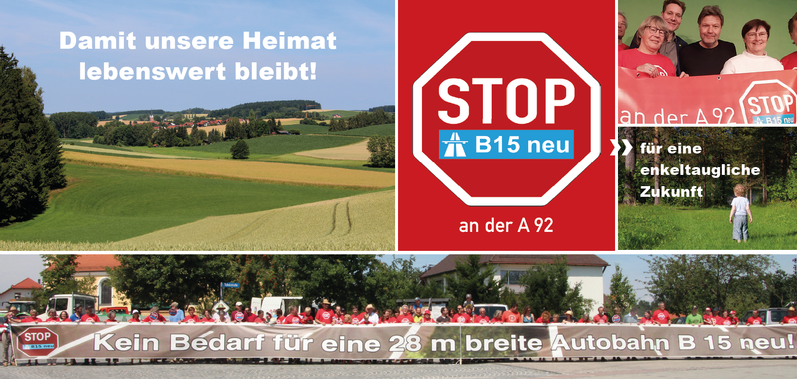 https://stop-b15-neu.de/ Vorderseite der Postkarte. Meinung auf den Weg bringen via Postkarte. STOP B15 neu an der A92.