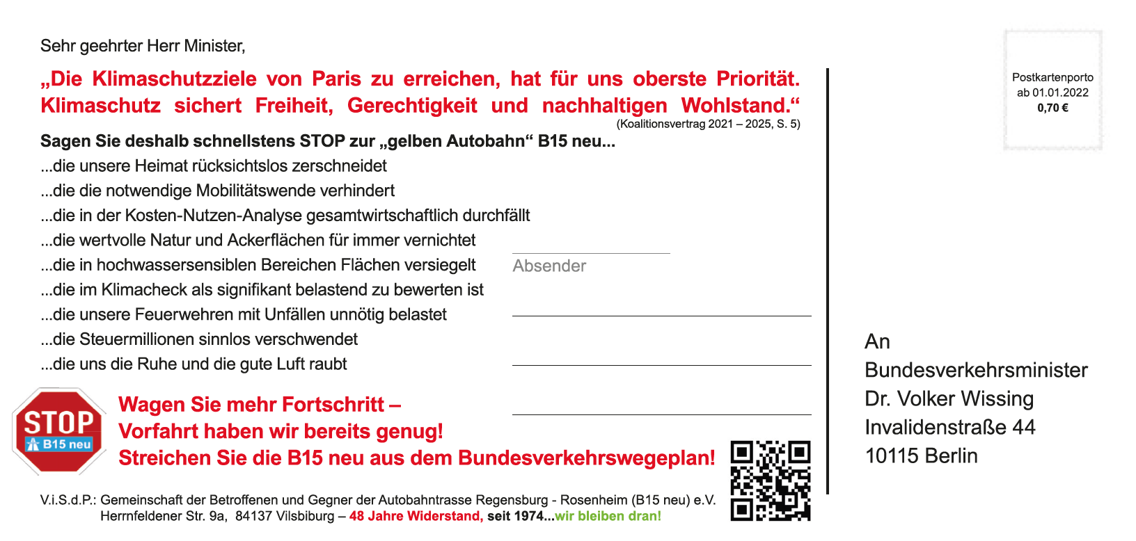 Meinung auf den Weg bringen via Postkarte. STOP B15 neu an der A92.