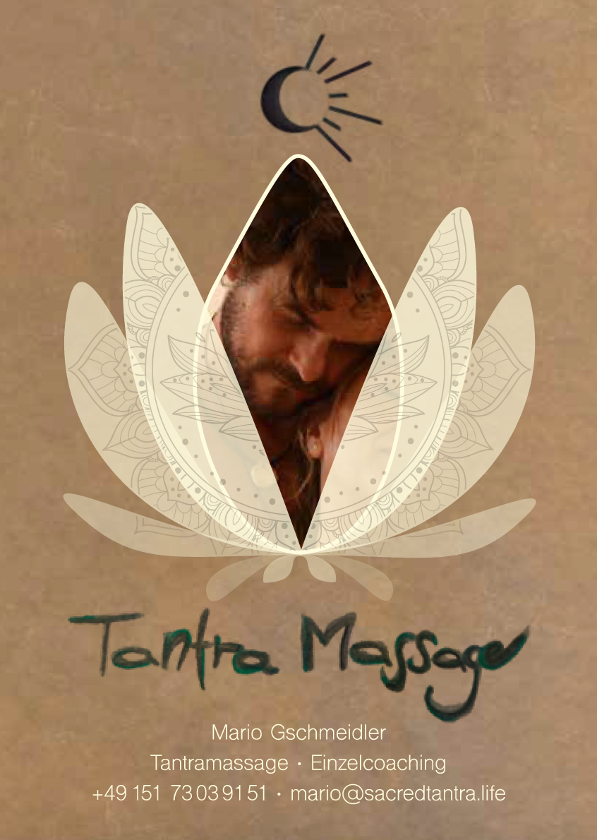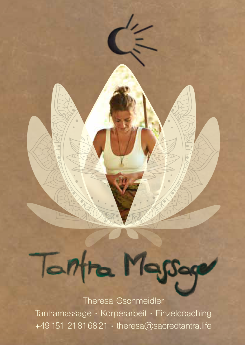 Gestaltung eines beidseitigen Flyers für Tantra Massage, Körperarbeit und Einzelcoaching yin&yang, weiblich und männlich im Einklang, ein harmonisches Spannungsverhältnis Schriftzug aus der Feder von Gschmeidler